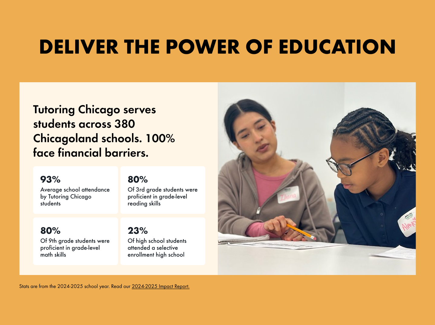 Donations fund tutoring resources, training for tutors, learning materials, and program expansion. Your gift directly helps Chicago students receive the academic support they deserve.