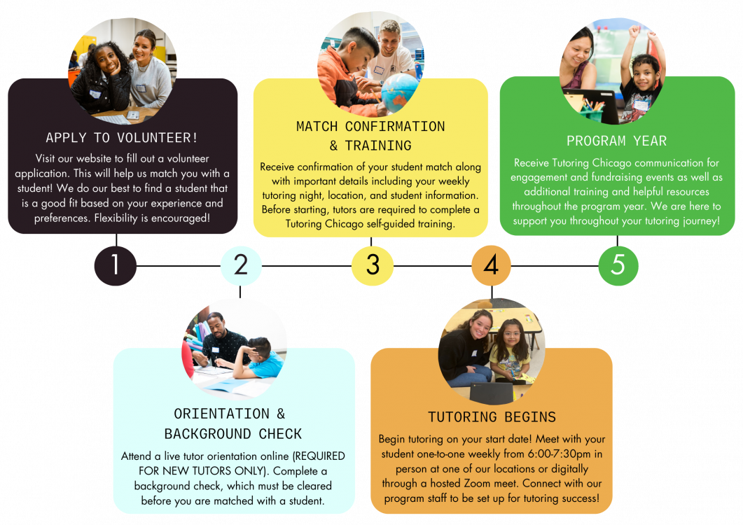 - PROGRAM YEAR – Receive Tutoring Chicago communication for engagement and fundraising events as well as additional training and helpful resources throughout the program year. We are here to support you throughout your tutoring journey!